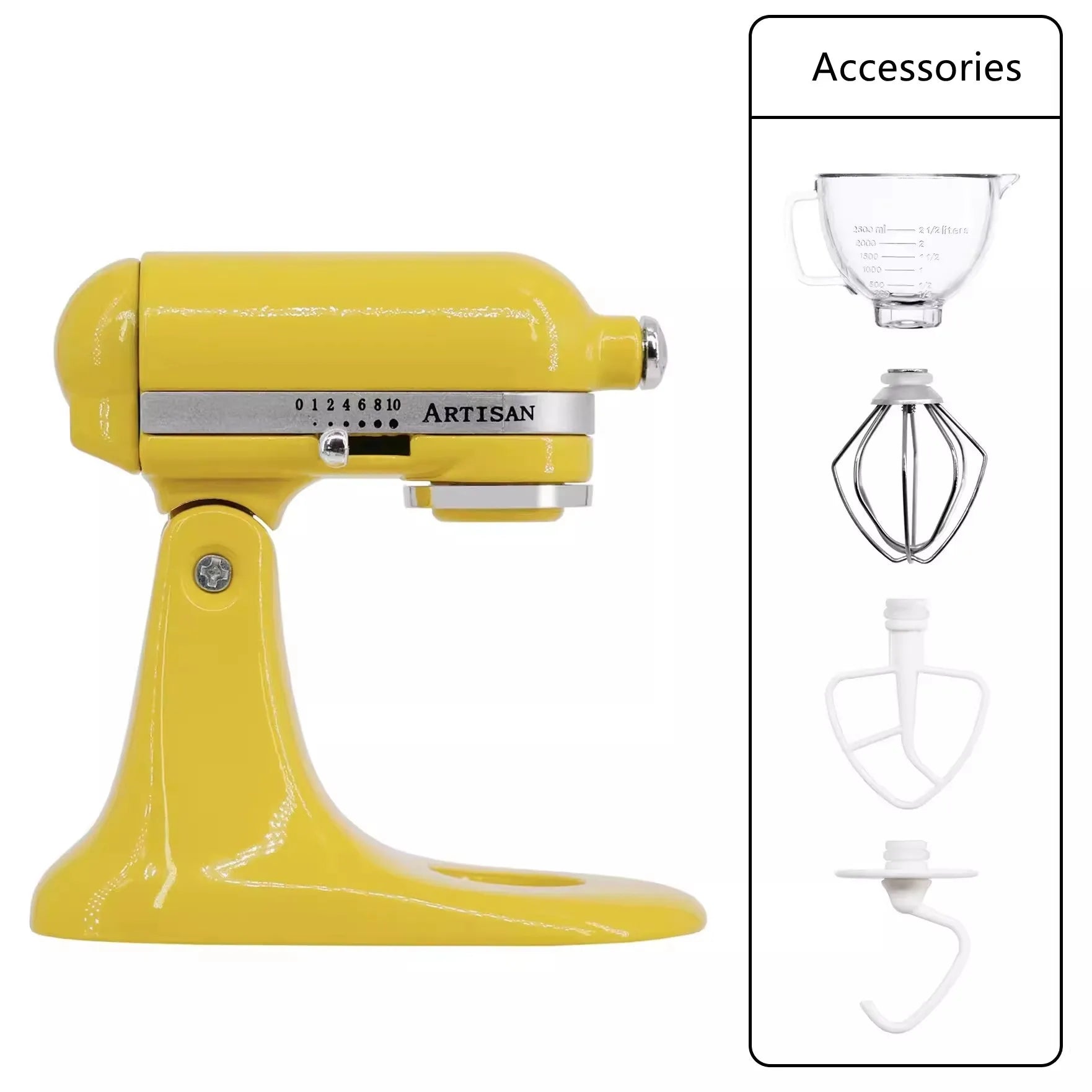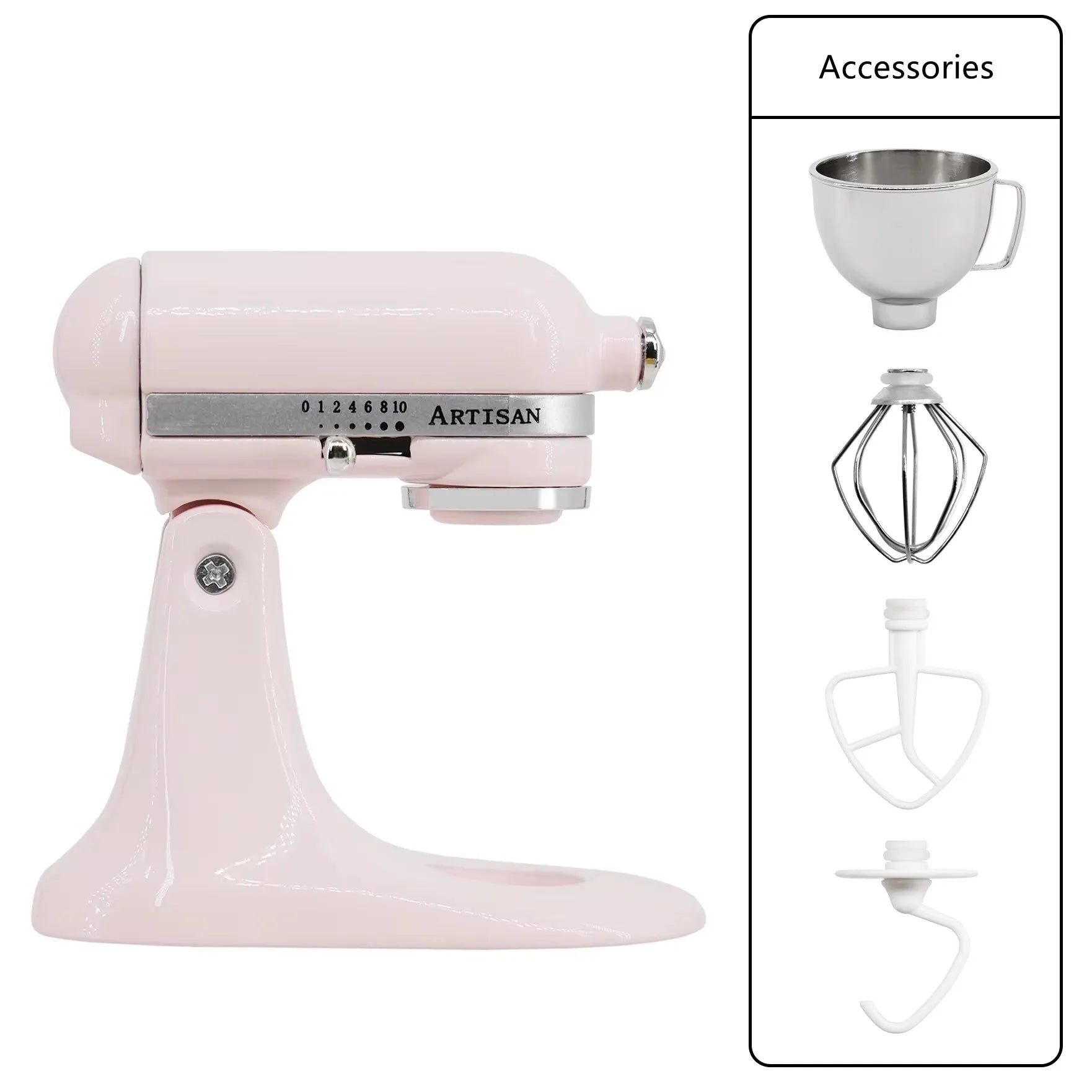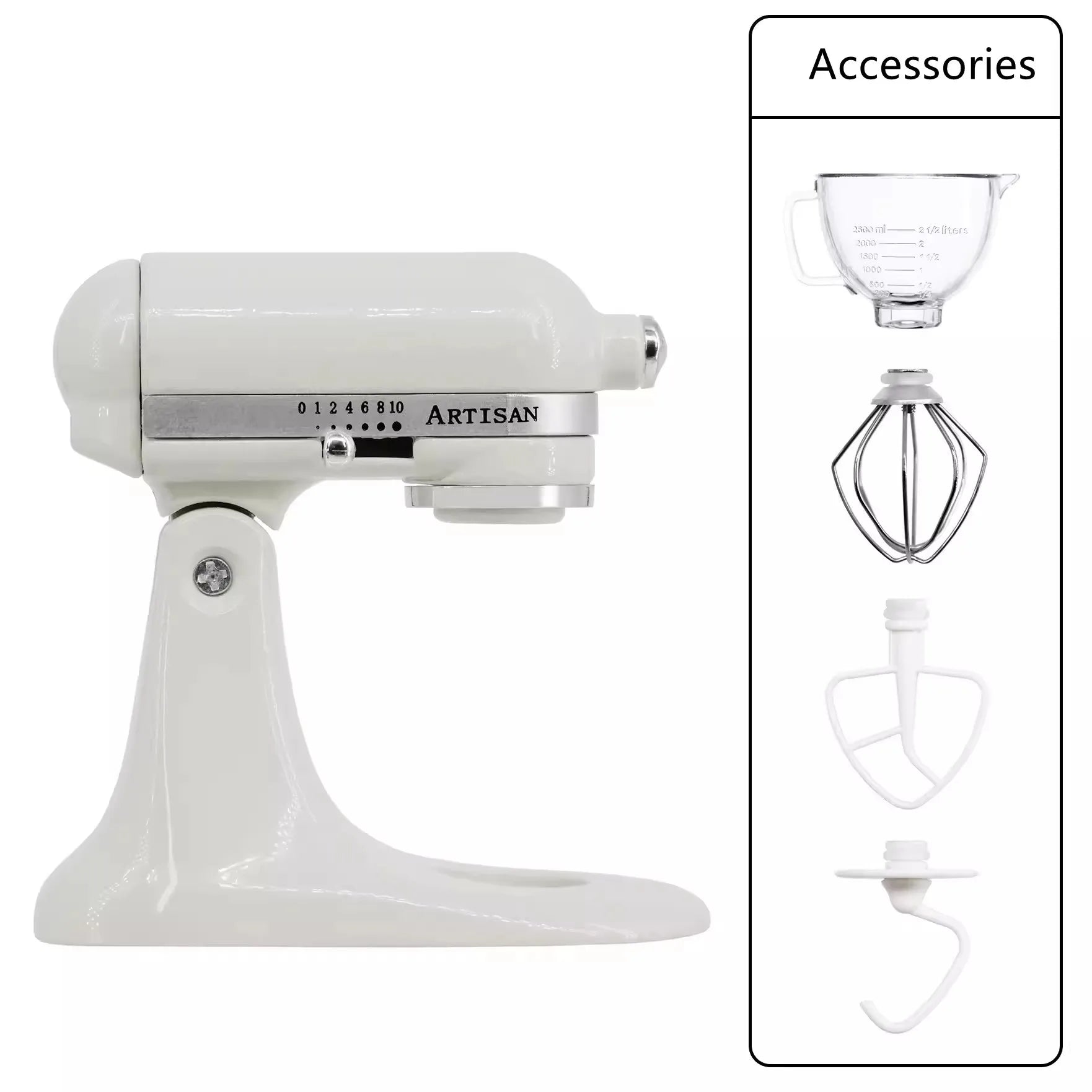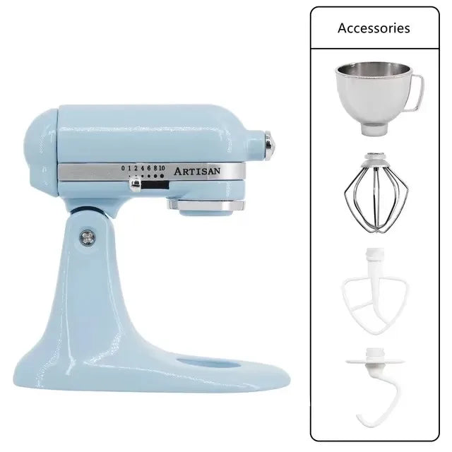 Contains: main unit, mixing bowl, dough hook, mixing paddle, whisk