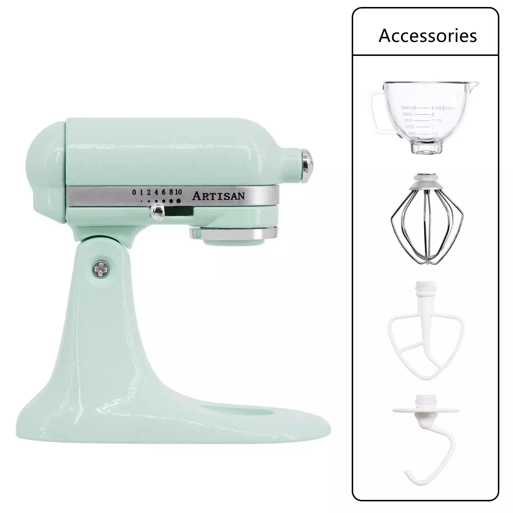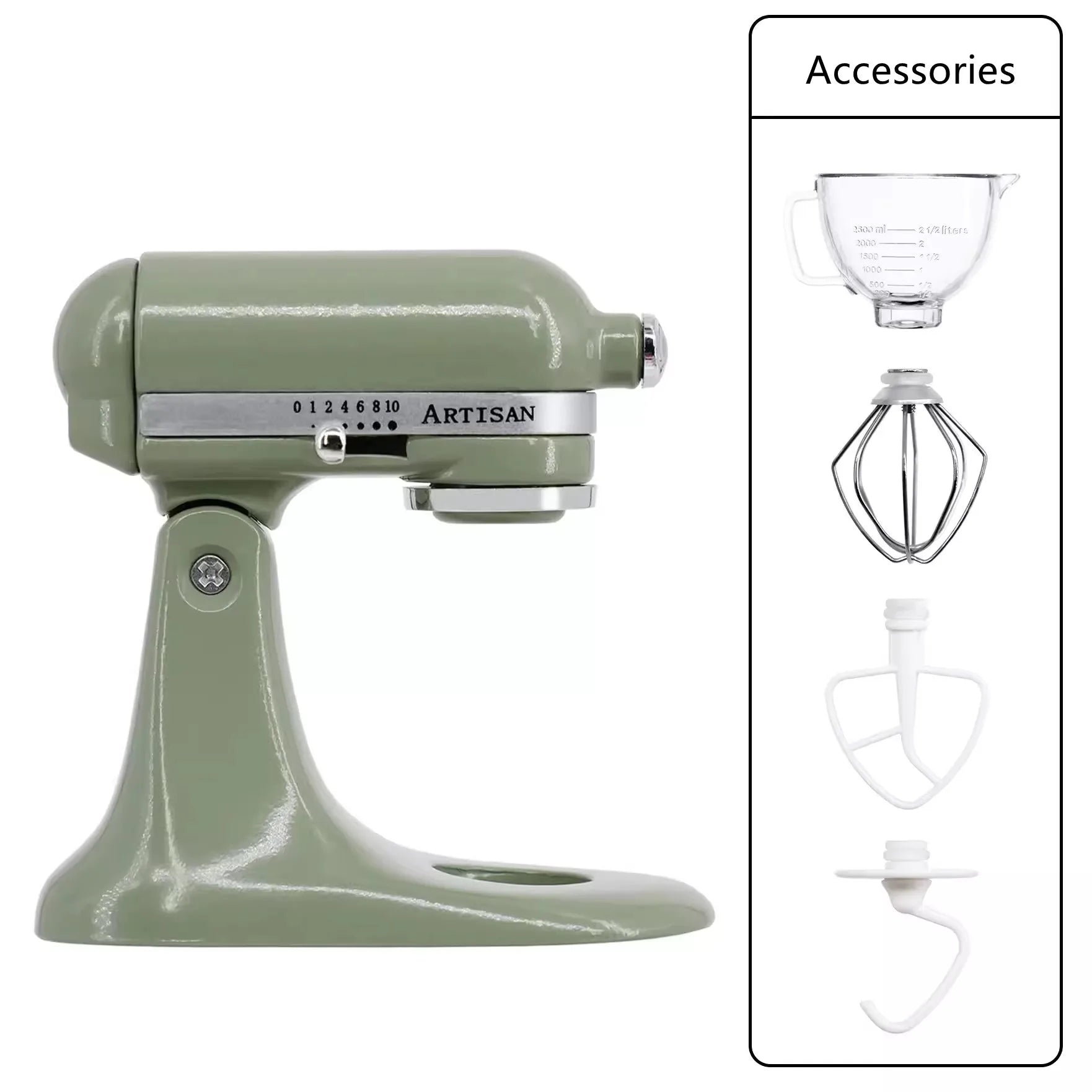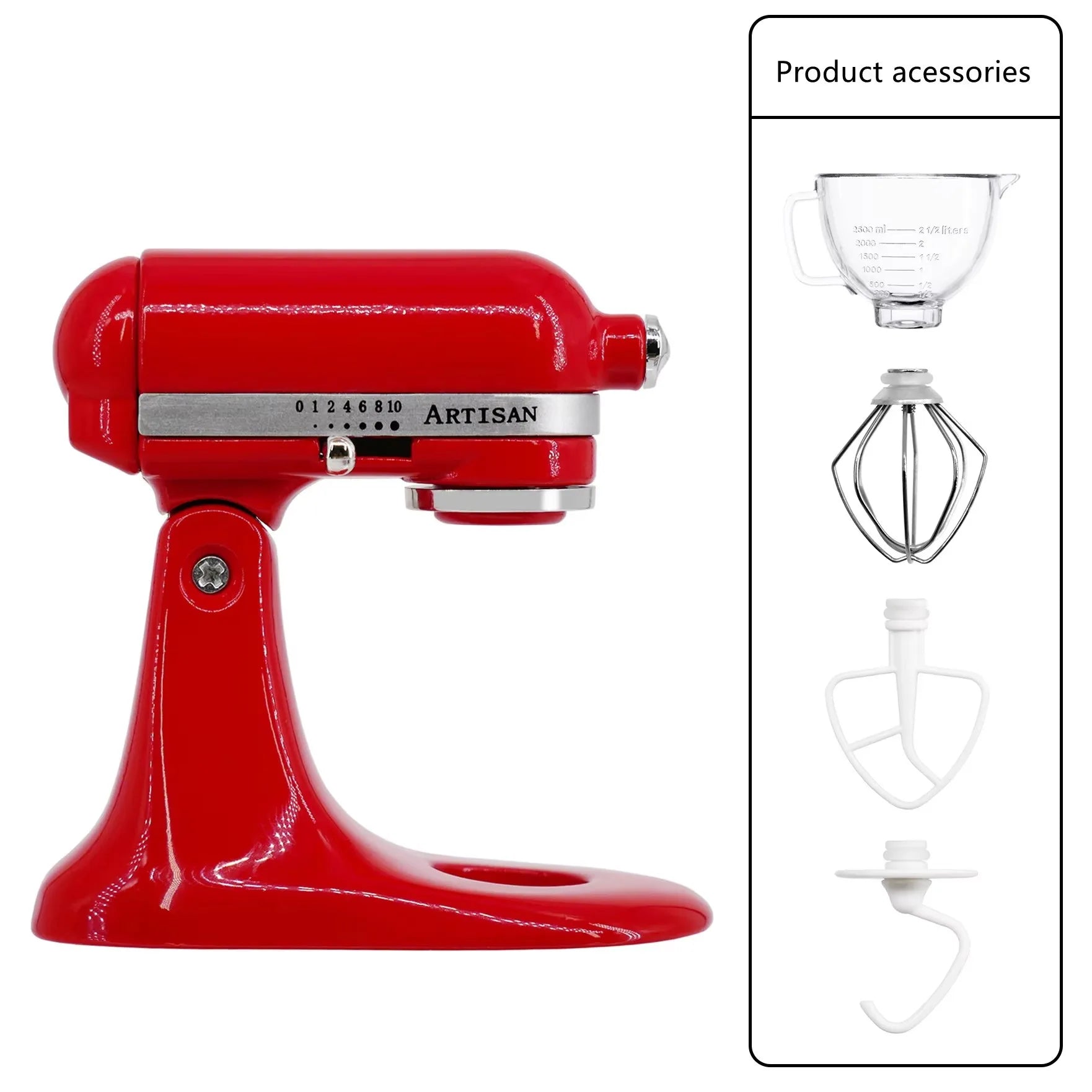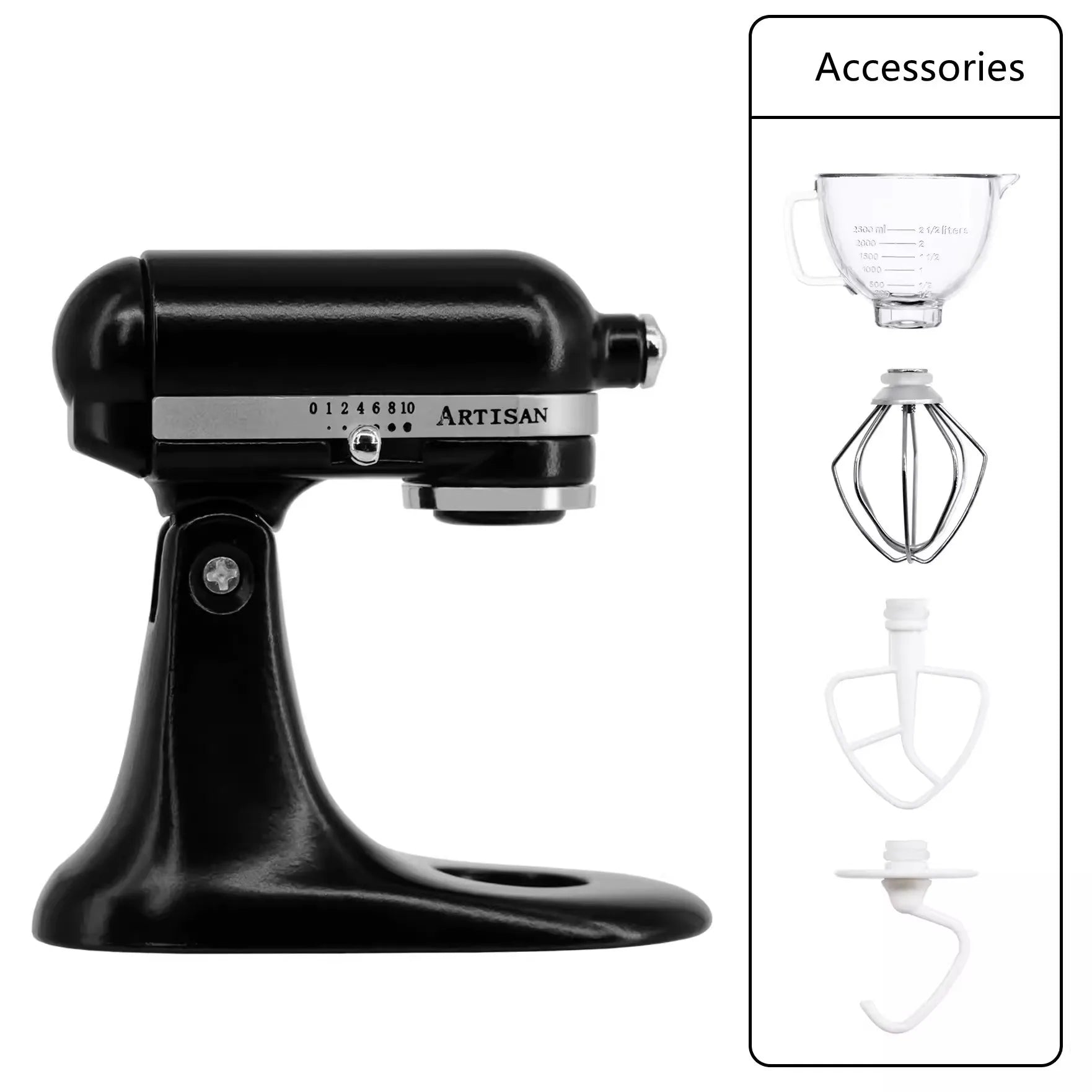 Contains: main unit, mixing bowl, dough hook, mixing paddle, whisk